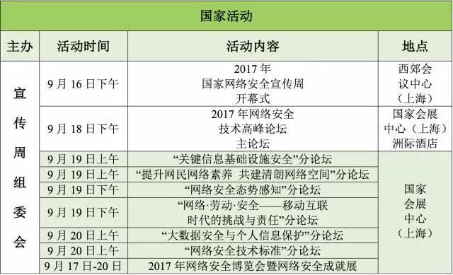 全国范围内统一举行,其中开幕式、网络安全博览会暨网络安全成就展、网络安全技术高峰论坛、一流网络安全学院示范高校授牌、先进典型表彰等重要活动在上海市举办