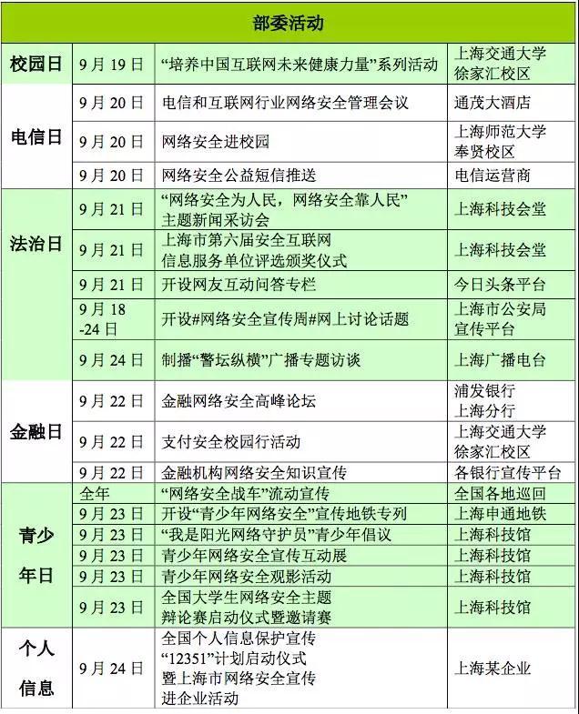 9月19日至24日,教育部、工业和信息化部、公安部、人民银行、共青团中央、全国总工会将分别组织开展校园日、电信日、法治日、金融日、青少年日、个人信息保护日等主题日活动。