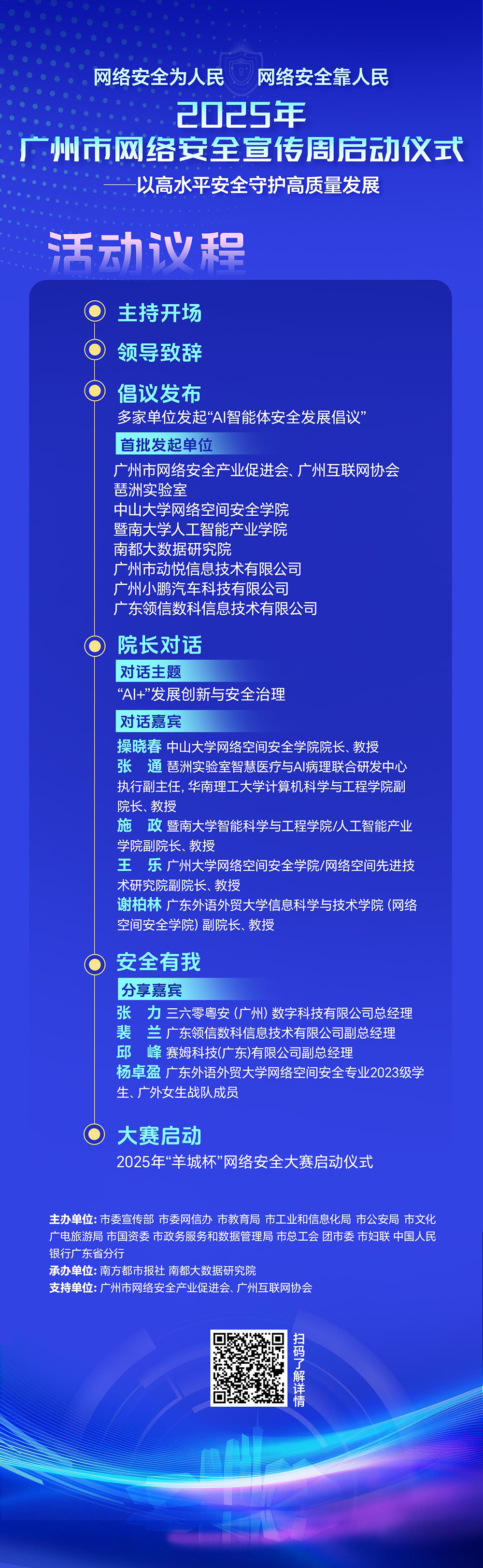 第12个国家网络安全宣传周来了。9月15日上午,“2025年广州市网络安全宣传周启动仪式”将举行,聚焦AI时代网络安全工作,多家单位共同发起“AI智能体安全发展倡议”,高校院长共话“AI+”发展创新与安全治理,并为十五运会和残特奥会网络安全保障体系建言献策,助力高质量发展迈上新台阶。