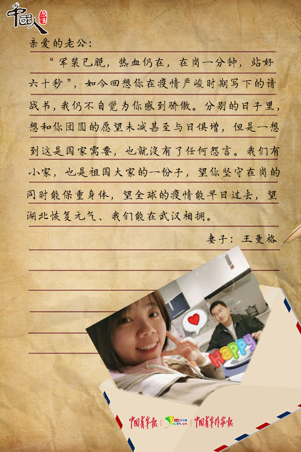 “向你汇报下我这边的情况,勤务防护全面,营区物资充足,执勤之外的时间,我会按时吃饭,每天锻炼。不用太担心我,一切都好。快要复工了,你要慢慢调整作息,保证元气满满地回到工作岗位……”疫情期间,王曼格用一封家书表达思念与鼓励,高明的回信让远在外地对自己挂心不已的妻子感到安心。
