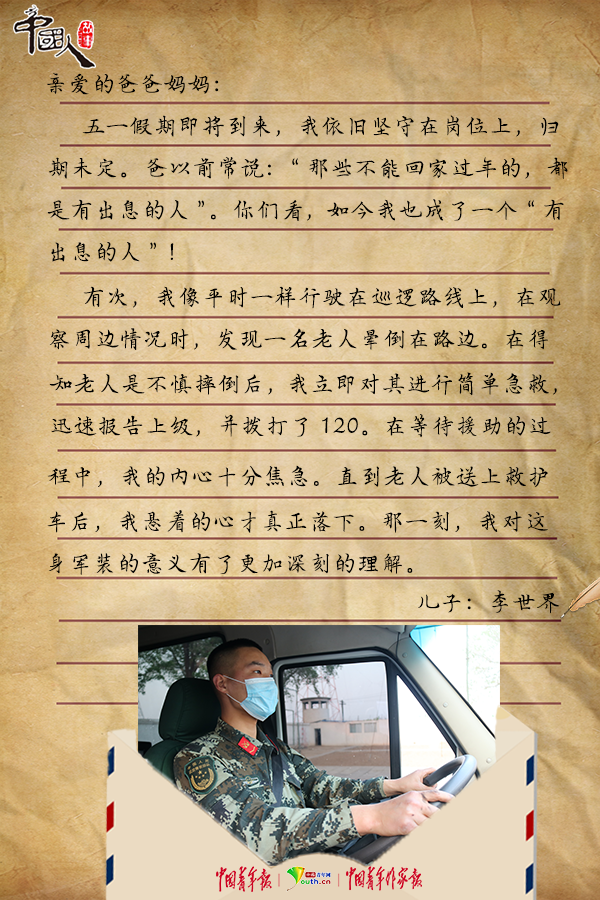 疫情就像一场没有硝烟的战争,李世界和战友们在做好防护工作的同时,在岗位上恪尽职守。巡逻工作单调、辛苦,但李世界总是乐呵呵的,在他看来,“劳动”和“奋斗”并不是宏大的概念,而是立足岗位,兢兢业业做好自己的本职工作,把“为人民服务”融入血液。他说:“身为军人,有三件事不能避:为民牺牲不能避,为国赴难不能避,临危受命不能避。”