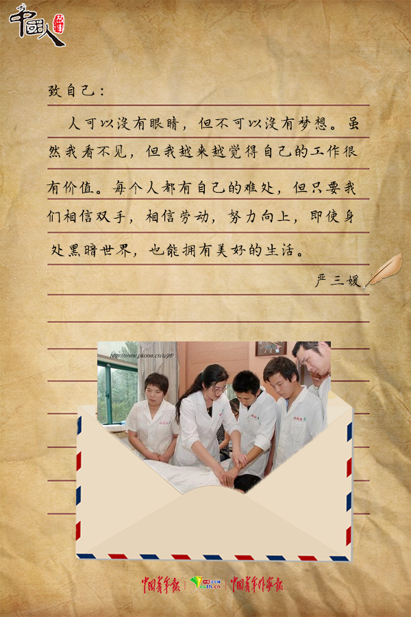 1989年,19岁的严三媛患上继发性青光眼后双目失明,从此坠入黑暗世界。短暂消沉后,她走上学习中医推拿的道路,逐渐小有名气。为了帮助更多盲人融入社会,2000年,严三媛创办江苏省无锡市第一家盲人推拿按摩院,7年后,又创办无锡好轻松盲人推拿按摩有限公司。多年来,公司累计安置千余名盲人就业,帮扶50多名盲人成功创业,向社会爱心捐款60余万元。2019年5月16日,严三媛被授予“全国自强模范”称号,代表全国8600万残疾人在人民大会堂发言,讲述自己的奋斗故事。