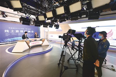 4月2日,位于河北省秦皇岛市海港区金梦海湾片区的中瑞设计港内,园区入驻企业工作人员使用网络平台直播发布招聘信息。 曹建雄摄(人民视觉)